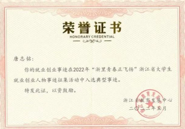 近日,浙江省教育发展中心公布了2022年“浙里青春正飞扬”浙江省老员工就业创业人物事迹征集评选结果,公司体育教育192班唐志铭同学荣获“军营老员工战士典型人物”称号。