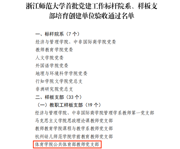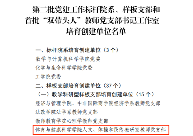 近日,qy球友会体育党委公布首批党建工作标杆院系、样板支部培育创建单位验收通过名单和第二批党建工作标杆院系、样板支部和首批“双带头人”教师党支部书记工作室培育创建单位名单。qy球友会官网公共体育部教师党支部通过校首批党建工作样板支部培育创建单位验收。人文、体操和民传教研室教师党支部、体育、学科教学(体育)硕士研究生第二党支部获立第二批党建工作样板支部培育创建单位。