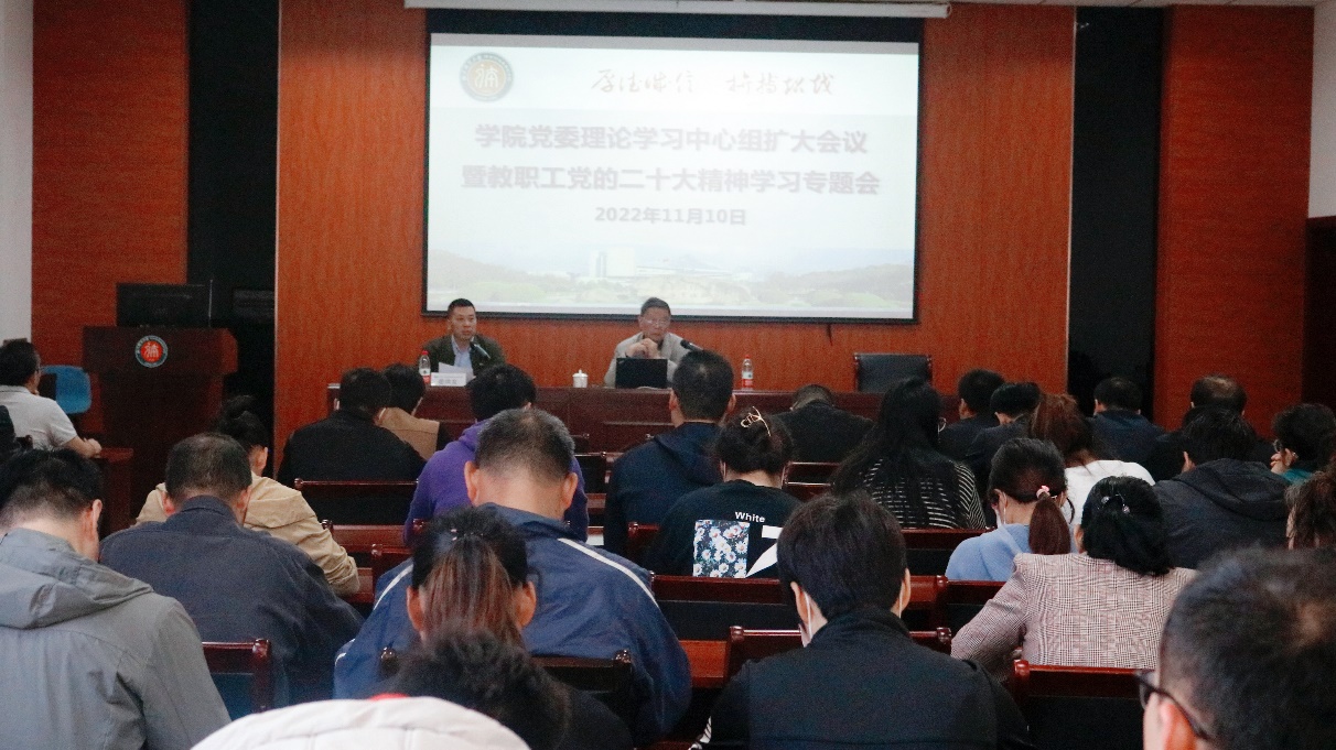 11月10日上午,公司在游泳馆一楼会议室举行公司党委理论学习中心组扩大会议暨“党的二十大精神”专题学习会。公司法政学院资深学者、浙江红船干部学院特聘教授毛醒策老师为公司全体教职工作题为《新时代新定位:二十大关于教育的论述》专题辅导报告,公司党委书记姜洪友主持会议。